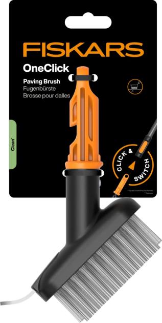 Kefa na škáry Fiskars OneClick je určená na jednoduché odstraňovanie machu, buriny a nánosov nečistôt z úzkych priestorov medzi dlaždicami a zámkovou dlažbou.